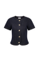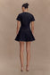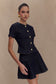 The BETHANY Short Sleeve Buttoned Denim Top is a fresh take on structured femininity. Featuring a sleek round neckline and short sleeves, this fitted design flatters the figure while front and back paneling add a touch of modern tailoring. The flared hem shape creates a soft, feminine finish, while custom mismatched buttons bring a unique and playful detail. Pair it with the Arista Denim Mini Skirt for a coordinated look that blends effortless charm with contemporary edge.