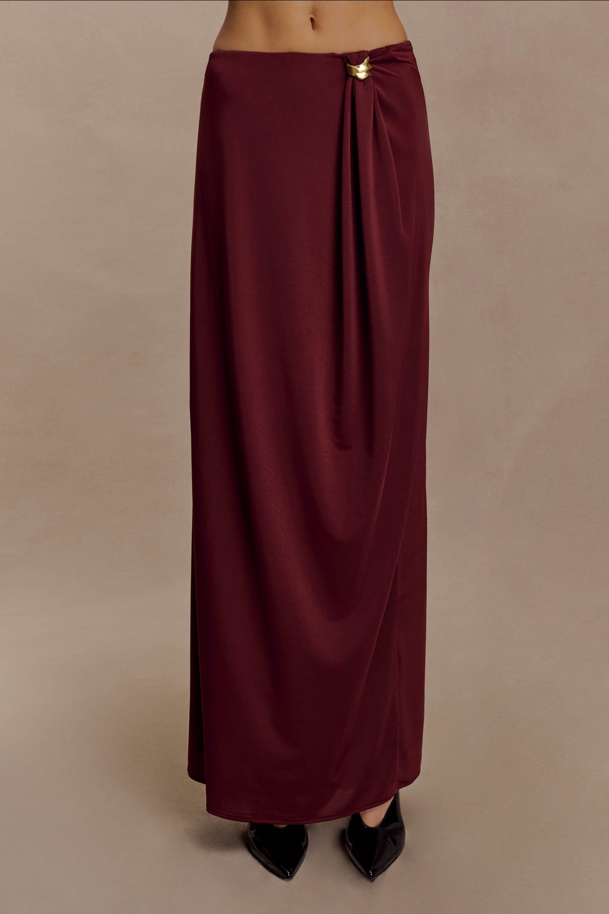 The BRIDGET Slinky Maxi Skirt With Hardware offers a modern twist on a timeless silhouette. Designed to sit smoothly at the waist, it features a fitted shape that flows into a maxi length for a streamlined finish. Subtle hardware accents add a touch of edge, balancing elegance with contemporary detail. Fully lined for comfort, this skirt is made to pair effortlessly with statement tops or its coordinating pieces for a refined, high-impact look.