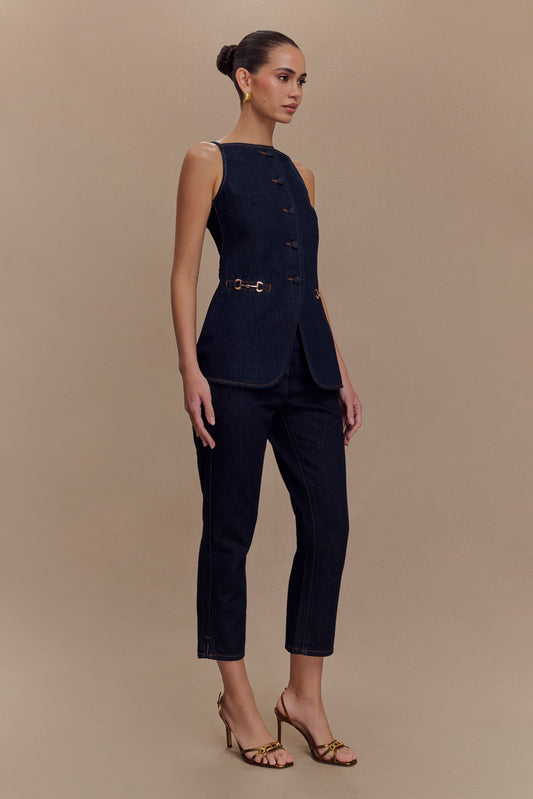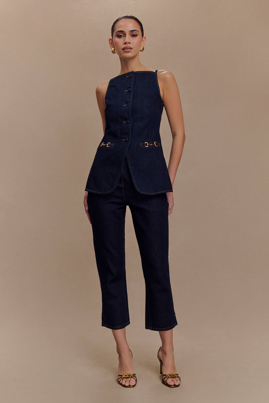 The CAITLIN Mid Rise Denim Jeans offer a modern take on classic denim, designed for both style and comfort. With a flattering mid-rise waist and a sleek, straight-leg fit, these jeans elongate the legs while maintaining a relaxed silhouette. The fly front closure ensures a secure fit, while the front and back pockets add both functionality and detail. Finished with a waistband-less design for a smooth, contemporary feel, these jeans are perfect for elevating your everyday casual look. Pair with the Dayna Denim Halter Top for a complete, effortlessly chic ensemble.