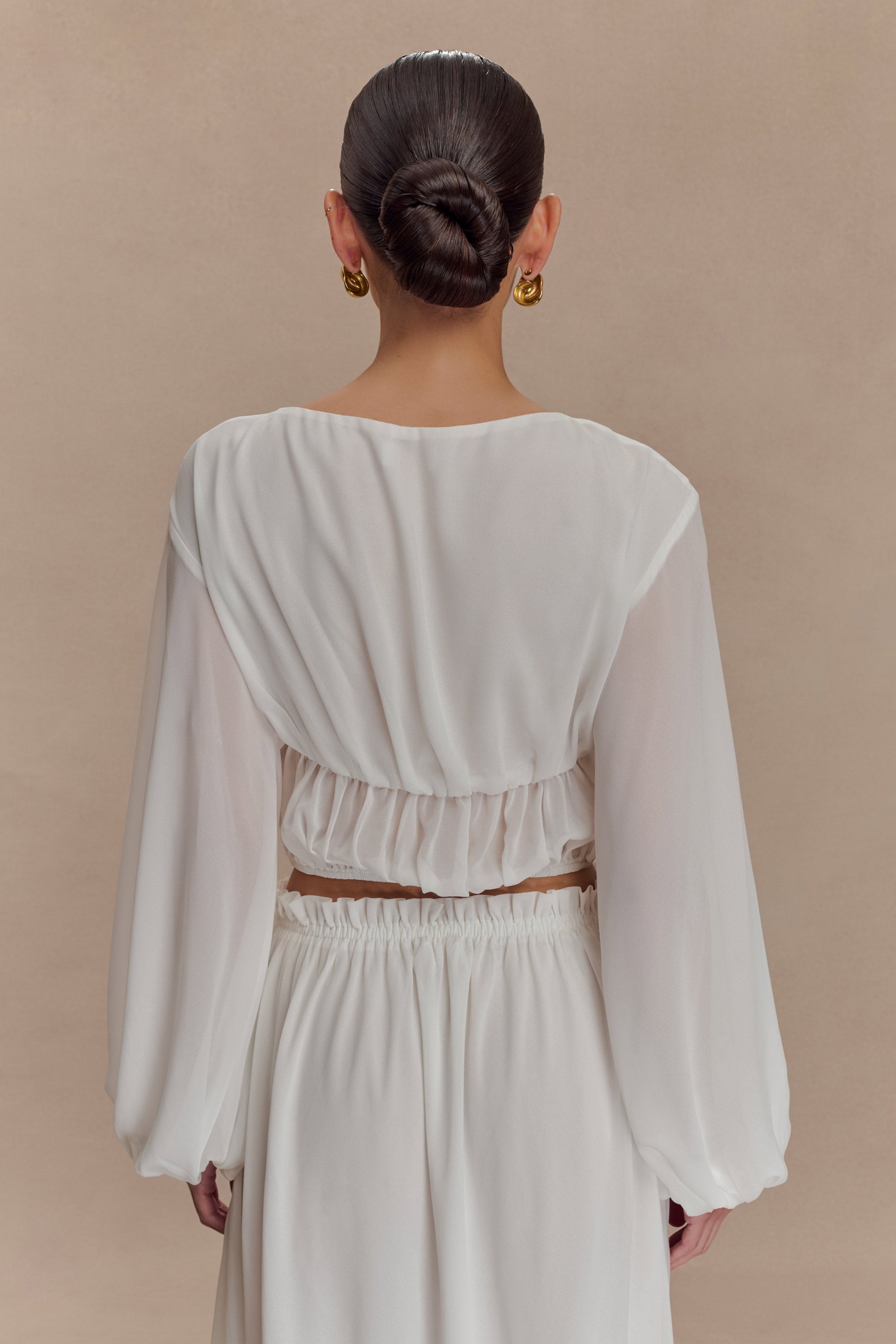 The CARLIE Chiffon Cross Tie Top brings a breezy sophistication to your wardrobe staples. Designed with delicate criss-cross rouleau ties and a flattering cropped silhouette, it features a softly lined bust, long sheer sleeves, and an elasticated waist hem for a comfortable fit. Its relaxed shape and fluid chiffon fabrication make it perfect for pairing with skirts, tailored pants, or your favourite denim for an effortlessly styled moment.