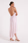 The CASEY is a midi dress with a wide, cinched waist, low, open back, and deep V-neckline. It combines a classic silhouette with a sleek MESHKI blend fabrication that elevates it for evening events. The wrap skirt features an open, asymmetrical front hem with draped, long pleats about halfway down. The shoulder straps start out as thin spaghetti straps and widen into angled panels that cup the chest and tuck neatly into the bodice.