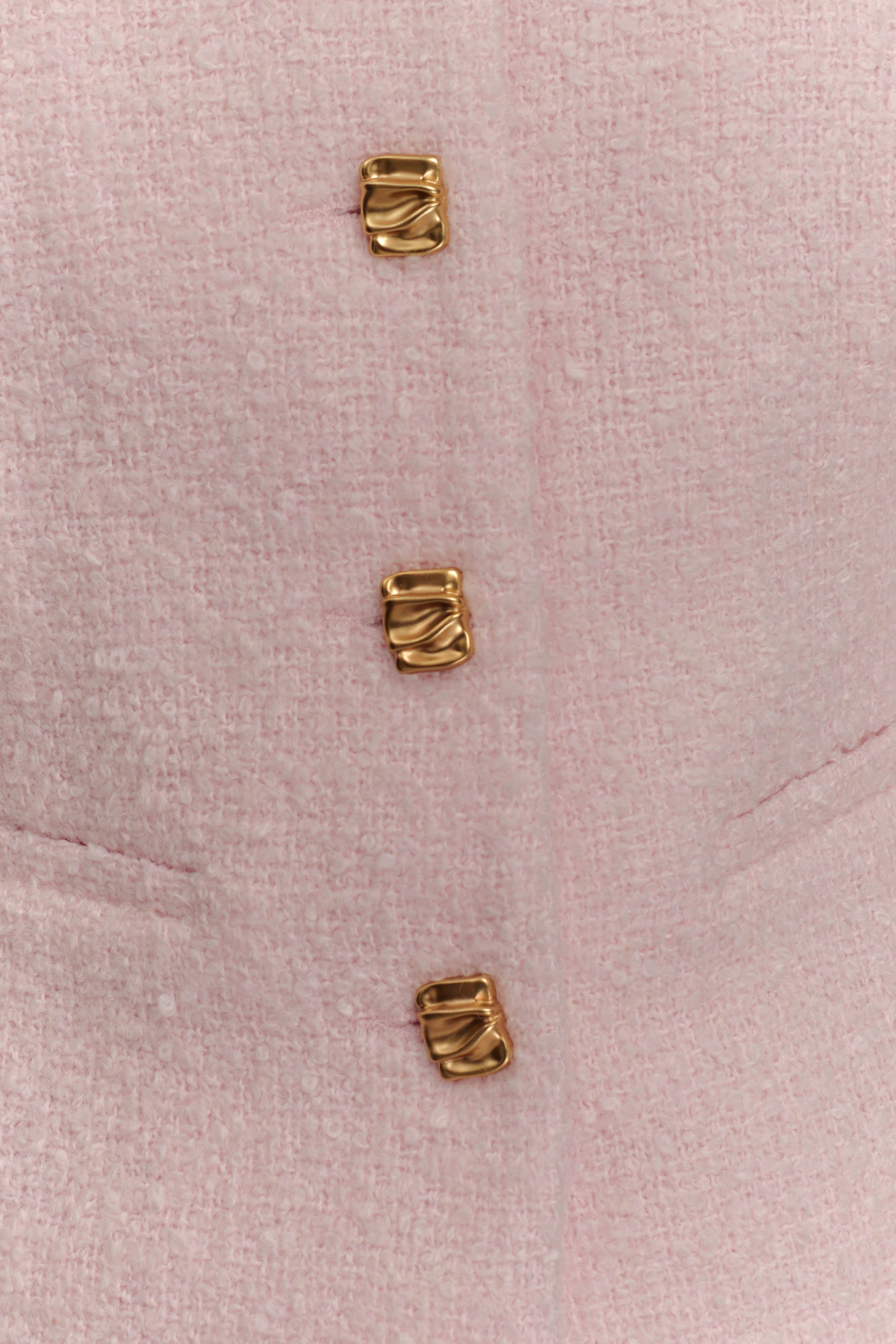Elevate your wardrobe with the CLEO Boucle Jacket, a timeless piece that blends classic tailoring with modern elegance. Featuring a refined round neckline and structured shoulder pads, this jacket creates a polished silhouette. The button-front closure and button sleeve details add a touch of sophistication, while non-functional pockets maintain a sleek and tailored appearance. Designed to pair perfectly with the Cleo Boucle Mini Skirt, this ensemble delivers effortless style that transitions seamlessly from daytime chic to evening glam.