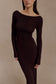 The CLEONA Merino Ribbed Long Sleeve Maxi Dress is a timeless staple with a sculpted edge. Crafted in a soft merino rib knit, it’s designed with a classic boat neckline and long sleeves for a clean, elongating silhouette. Front and back pleat details add subtle texture to its bodycon shape, while the maxi length creates a refined, streamlined finish. Left unlined for a lightweight feel, this dress transitions seamlessly from day to evening with understated elegance.