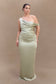 The DALIA Off-Shoulder Satin Maxi Dress is a statement of modern sophistication. Designed with an asymmetrical draped neckline, this sleeveless silhouette exudes effortless glamour. The fitted, boned bodice provides structure and support, while the gathered hip detail enhances the figure with soft, sculptural draping. Crafted in a fluid satin fabric and finished with an internal elastic waist stay for a secure fit, this maxi-length gown moves beautifully with every step. A discreet side zip and hook-and-eye closure ensure seamless wear, making this dress perfect for elegant soirées, black-tie events, or bridal celebrations.