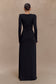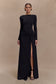 The DEANNA Long Sleeve Gathered Maxi Dress is a confident take on classic evening wear. Framed by a boat neckline and statement shoulder pads, this dress creates a bold yet feminine silhouette. Its bodycon fit is elevated with a front waist twist and gathered hip detail, designed to enhance and define. A thigh-high side split adds subtle drama, while the partially lined finish keeps the look sleek and sculptural. Perfect for nights that call for quiet power and polished allure.