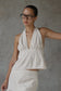 Effortlessly chic and feminine, the DELFINA Linen Halter Top adds a touch of sophistication to your summer wardrobe. With a halter neckline and a V neckline, this top elegantly frames your collarbone while offering a flattering silhouette. The front panel detailing adds a subtle yet stylish touch, complemented by a frill hem that adds a playful and whimsical vibe. The low back design adds a hint of allure and showcases a hint of skin, making it perfect for warm days and evenings. Fully lined for comfort and quality, the Delfina Linen Halter Top is a versatile and must-have piece that transitions seamlessly from casual outings to more dressed-up occasions with ease. Pair with the matching Delfina Linen Mini Skirt With Ruffle to complete the look.