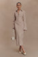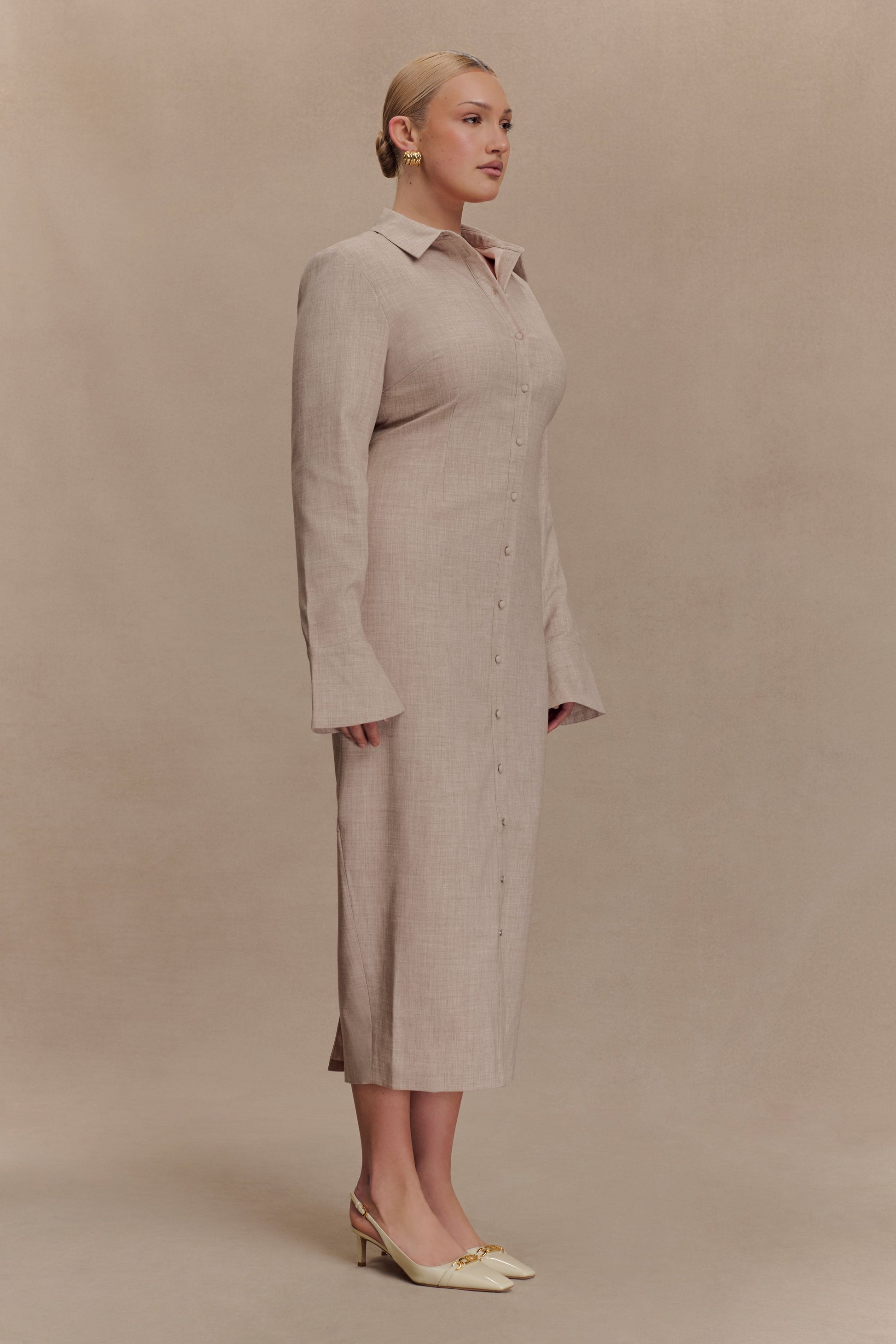 The DORIAN Fitted Shirt Midi Dress exudes timeless elegance with its classic design and sophisticated details. Featuring a collared neckline and a functional centre front button closure, this dress offers a tailored, polished look. The long sleeves with flared cuffs add a touch of modern flair, while the midi length provides a versatile and graceful silhouette. A centre back vent ensures ease of movement, and the unlined construction offers a lightweight feel. The Dorian Dress is perfect for achieving a refined and stylish appearance, suitable for both professional and elegant occasions.