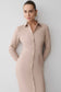 The DORIAN Fitted Shirt Midi Dress exudes timeless elegance with its classic design and sophisticated details. Featuring a collared neckline and a functional centre front button closure, this dress offers a tailored, polished look. The long sleeves with flared cuffs add a touch of modern flair, while the midi length provides a versatile and graceful silhouette. A centre back vent ensures ease of movement, and the unlined construction offers a lightweight feel. The Dorian Dress is perfect for achieving a refined and stylish appearance, suitable for both professional and elegant occasions.