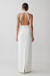The ELAN Stretch Crepe Maxi Dress delivers sculpted elegance with striking modern detail. Designed with a high neckline and fitted bodycon silhouette, it creates a sleek, elongated shape through the body. A front cut-out introduces subtle allure, balanced by an open back with delicate strap detailing and a button neck closure. Finished with an invisible zipper and a back leg split for movement, this fully lined maxi dress blends clean structure with confident edge.