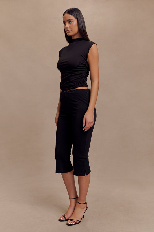 The ELLIA High Neck Sleeveless Top is a chic and versatile addition to any wardrobe, offering a sophisticated touch to both casual and tailored looks. Featuring a high neckline and sleeveless design, this top showcases elegant ruched side details that enhance its flattering silhouette. The longline cut adds a sleek, elongated shape, while the lined jersey fabrication ensures a comfortable, smooth fit. Ideal for pairing with jeans for a casual yet refined look or with tailored pants for a polished, professional ensemble, the Ellia Top seamlessly blends style with versatility.