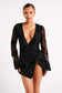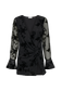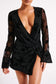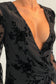 EMORY is a mini velvet wrap dress with a deep V-neckline, custom burnout print, and fitted sleeves with flared cuffs. The wrap detail allows for a curve-hugging fit while the invisible side zipper and polyester lining ensure maximum comfort, no matter the time of day. The custom velvet burnout print lies over the smooth MESHKI blend fabric on a separate mesh layer, adding depth and visual detail.
