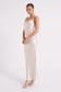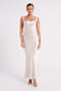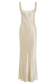 This is a sleeveless maxi dress with wide shoulder straps and a scooped neckline. Its back is a low, open affair with criss-crossed fabric straps around the base of the spine and clean, straight straps at the sides. Its custom satin fabrication paired with the invisible side zipper allows for a smooth, seamless silhouette. A fresh, flattering take on a classic cut, this dress is the perfect choice for an all-day outfit. Pair with the Geneva Square Diamante Mules to complete the look.