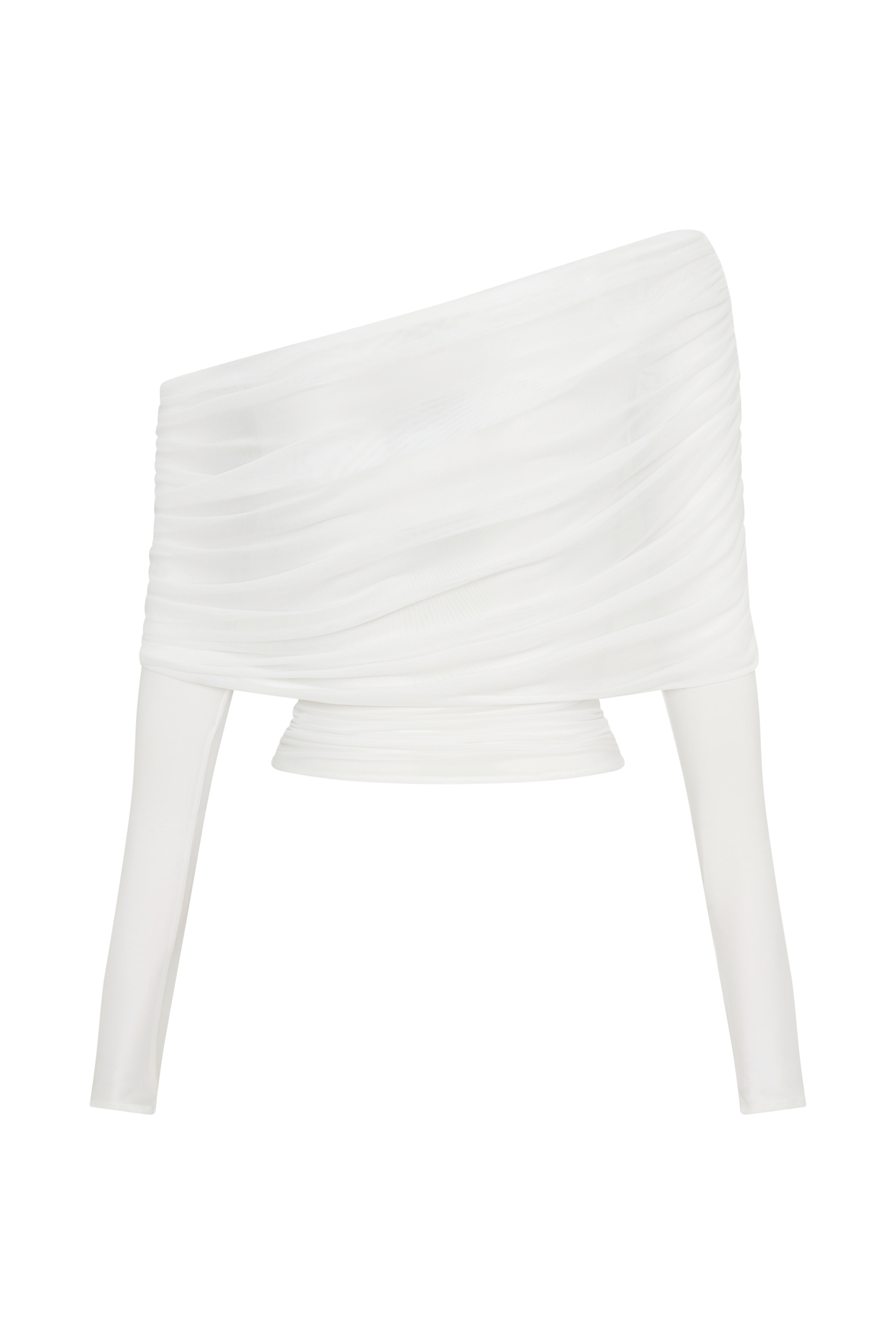 The EVERLY Sheer Mesh Off Shoulder Top exudes elegance and modern style. This top features an off-the-shoulder design and long sleeves, creating a sophisticated silhouette. Made from delicate mesh fabric, it offers a sheer look with a ruched overlay that adds texture and visual interest. The longline cut ensures a flattering fit, making it a versatile piece for both casual and dressy occasions. Embrace chic fashion with the Everly Sheer Off Shoulder Mesh Top.