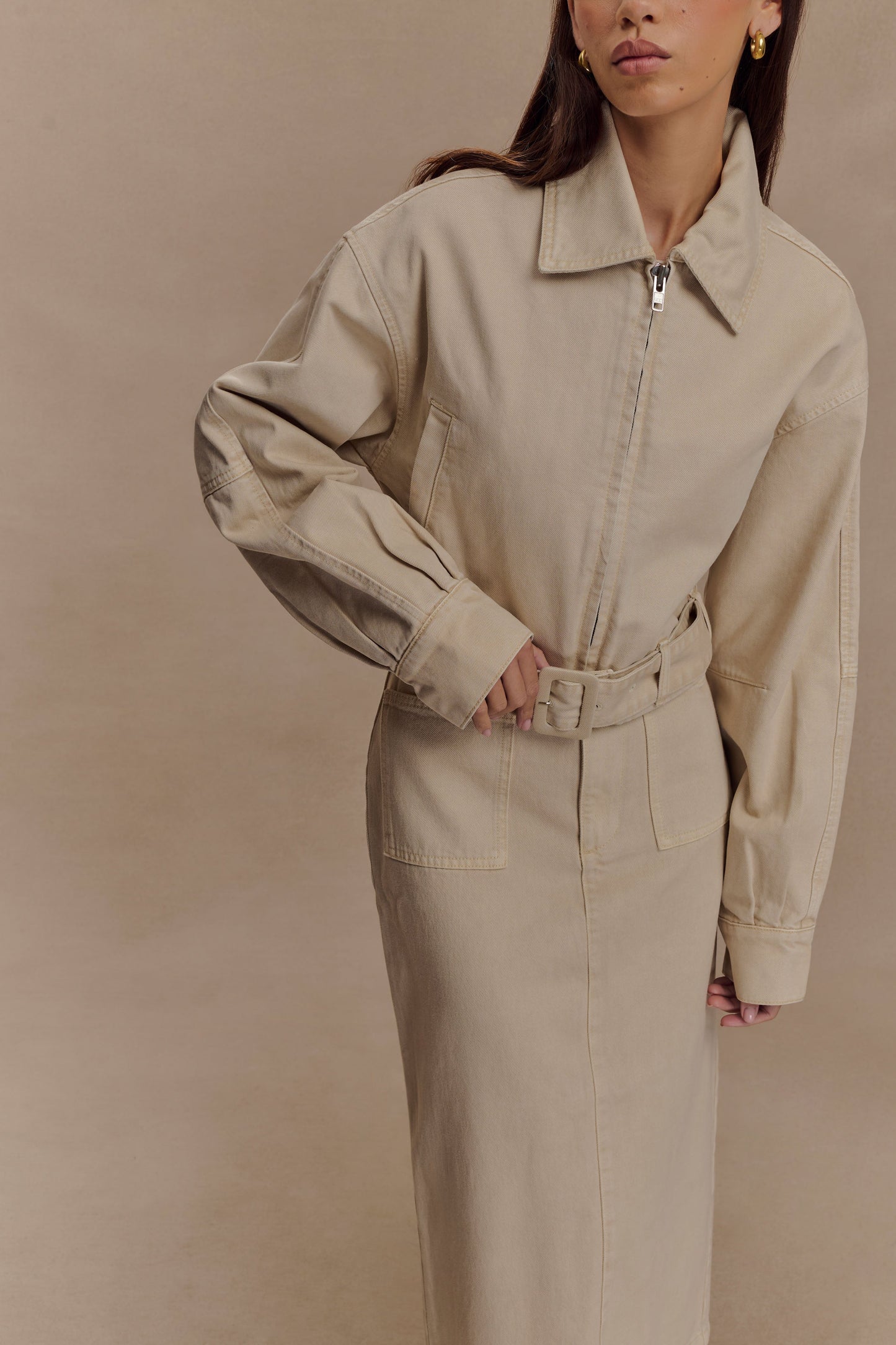 The FALLON Cropped Denim Jacket is your go-to layering piece with a fresh edge. Featuring a collared neckline, front zip opening, and long sleeves, this unlined jacket is elevated by a waist belt and buckle with functional belt loops for a cinched silhouette. A slightly gathered hem adds a soft touch to its structured shape, making it the perfect blend of utility and style. Pair with the Fallon Denim Midi Skirt for a coordinated denim look that’s effortlessly modern.