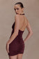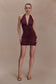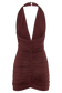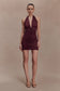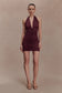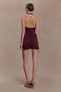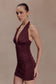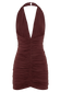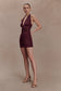 The FLEUR Ruched Slinky Mini Dress is designed to contour the body with soft precision. Featuring a halter neckline secured with a button closure, it frames the décolletage with understated elegance. Crafted in a smooth slinky fabrication, gathered detailing enhances the silhouette, creating flattering texture through the bodice and skirt. Fully lined for a smooth, confident finish, this mini-length dress delivers modern femininity with an elevated, after-dark sensibility.