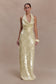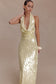 The GERTRUD Sequin Halter Maxi Dress is designed to captivate through movement and silhouette. Crafted in all-over sequin fabric, it features a softly draped cowl halter neckline secured with a back button closure, creating an elegant frame through the shoulders. A matching cowl at the back adds depth and fluidity, balancing the sleek column shape. Fully lined for comfort and finished with an invisible side zip and hook-and-eye closure, this maxi-length design is completed with a centre-back split for ease of movement. Polished yet expressive, this dress delivers a luminous impact with modern restraint.