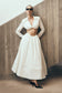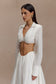 The GRETA Shirt Bra redefines shirting with sculpted detail. Featuring a V-neckline with a curved front hemline, it’s supported by an internal front wire frame to hold its shape. Gathering at the centre front bust enhances texture and dimension, while long sleeves with buttoned cuffs add polish. An elasticated back hemline ensures a secure, comfortable fit, making this top a striking yet versatile piece—perfect styled with high-waisted tailoring or its coordinating skirt for a modern set.