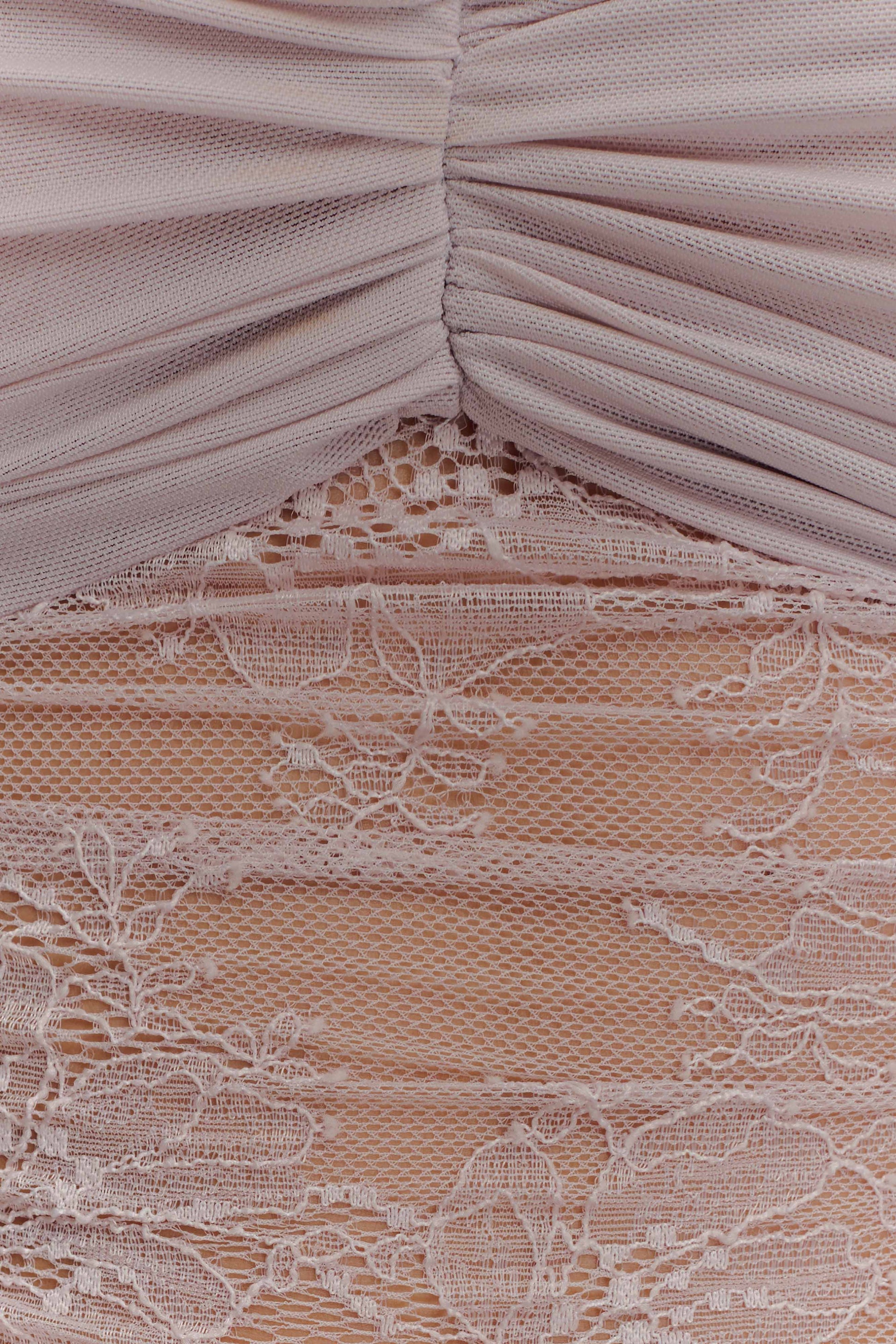 The GUINEVERE Lace and Mesh Top is a feminine statement piece designed to captivate. Featuring a sweetheart neckline and ruched cap sleeves, this cropped silhouette combines delicate mesh and lace panels for a beautifully textured finish. A ruched bust adds soft volume, while the open back brings an unexpected edge. Partially lined for comfort and sheerness in all the right places, pair it with the Guinevere Lace and Mesh Maxi Skirt for a coordinated look that blends classic romance with contemporary styling.