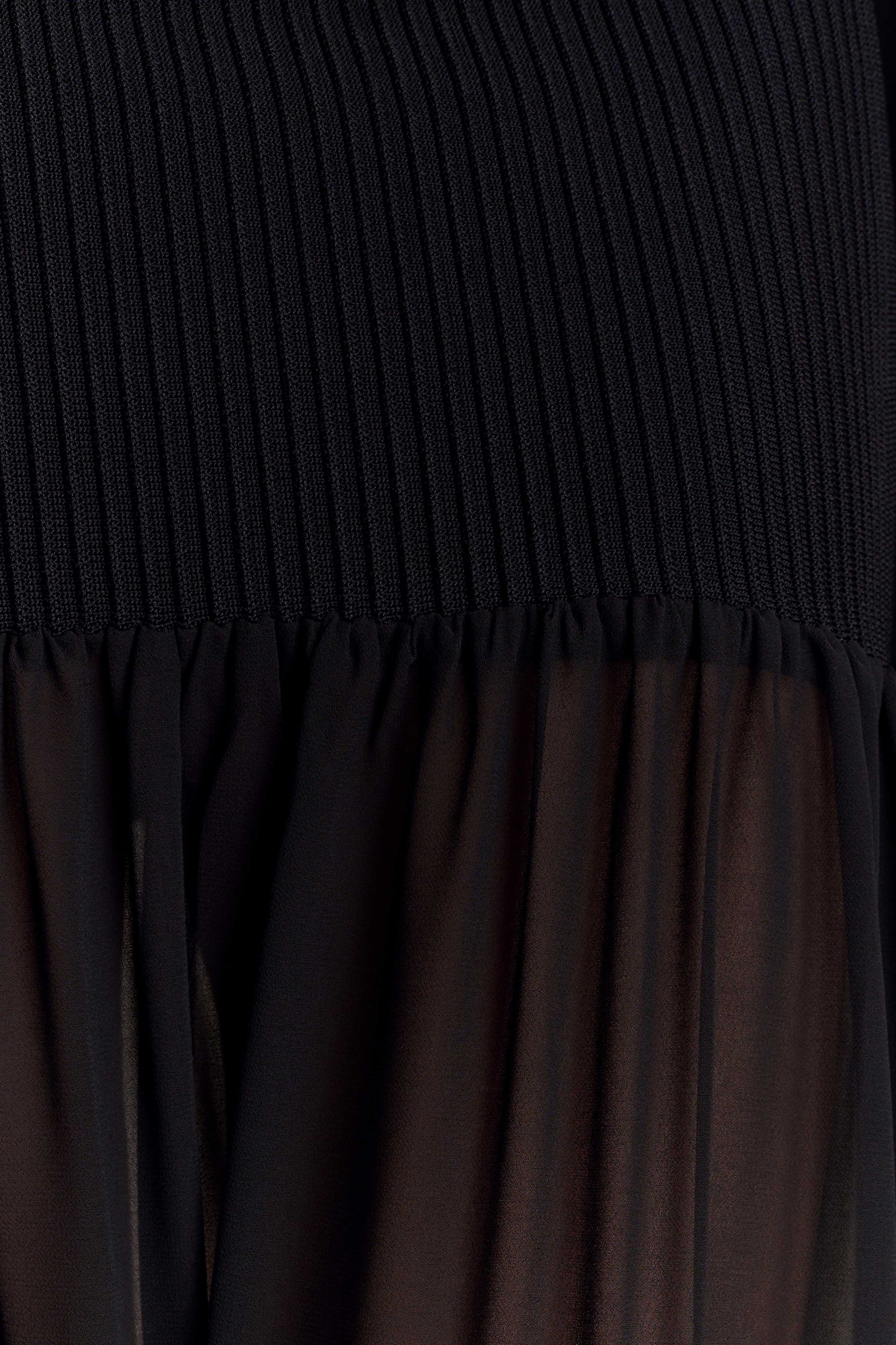 The HAILLE Knit Chiffon Maxi Dress blends contemporary texture with romantic fluidity. A ribbed knit bodice creates a sculpted silhouette, balanced by side waist cutouts and an airy open back. The boat neckline is accented with a chiffon shoulder scarf that drapes effortlessly, adding softness to the structure. Finished with a tiered chiffon skirt that flows with every step, this dress is made for movement—from daylight affairs to twilight celebrations.
