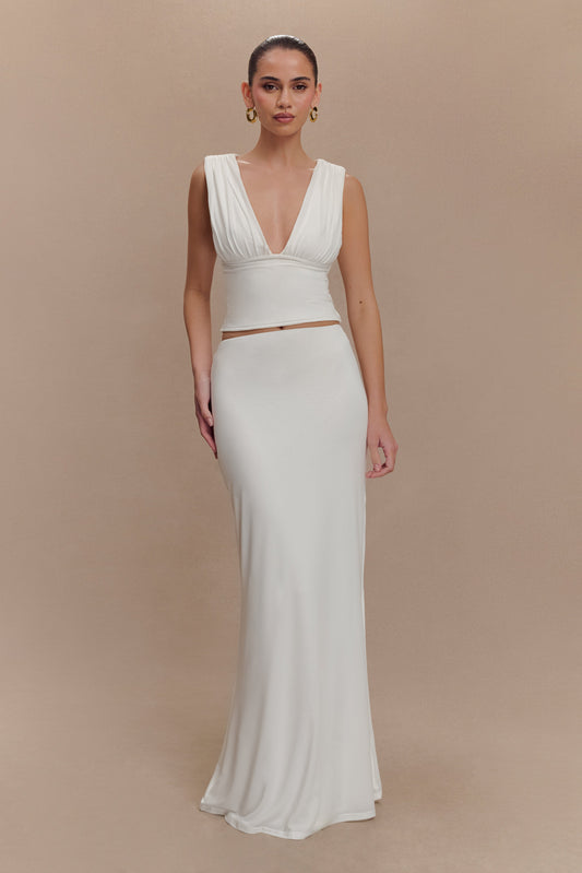 The JACINDA Cotton Maxi Skirt is a breezy blend of comfort and elegance. Designed with a flattering high-waisted silhouette and an elastic waistband for an easy fit, this skirt flows effortlessly with every step. The tiered design and delicate gathering detail add soft volume, while the crinkle cotton fabrication enhances its relaxed, airy feel. Partially lined for lightweight wear, this skirt is perfect for warm-weather days, casual outings, or effortlessly chic vacation styling.