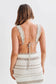 JADIA is a contrast crochet bralette tha features a V neckline at the front, lined with dark scalloped edging and a string tie at the back. The straps are adjustable and kept in place with a single thin back tie, so it can fit and flatter any type of body it's put on.