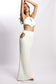 Cut a fine figure in JAYLENE. Incorporating eye-catching cut out details, edgy beaded fringing and our elegant flattering fluted style — Jaylene is made to see and be seen in. Pair perfectly with our Jaylene Keyhole Triangle Halter Top With Fringe to complete the formal look.