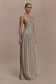 The JULIETTE Pleated Chiffon Maxi Dress is designed to move effortlessly between moments. Featuring a tie-back halter neckline, it offers the option to be worn strapless for a clean, streamlined look. Delicate pleating through the bodice and bust adds texture and depth, complemented by an under bust cut-out that introduces a modern point of interest. Set on a low waist, the column silhouette elongates the frame before falling to a graceful maxi length. Fully lined for comfort and finished with a centre-back invisible zip, this dress is fluid, composed, and quietly striking.