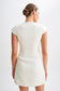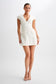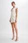 This is a sleeveless mini dress with a deep V-neckline, textured fabrication, and blazer details. Strikingly structured, this dress features a fitted bodice and A-line skirt for that classic suiting silhouette. Sewn-in shoulder pads paired with cap sleeves and a deep neckline add a powerfully feminine touch to a timeless cut. Contemporary details like faux flat pockets on the front and a cinched waistline further elevate this seasonal piece.