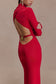 The KIYAH Slinky Cut Out Maxi Dress is a sleek, form-defining silhouette with directional detailing. Featuring a high neckline and long sleeves, it’s balanced by an open low-back cut-out with statement hardware for a touch of edge. Gathered shoulder accents create soft volume, while the fitted bodycon shape elongates the frame. Fully lined for a smooth finish and cut to a maxi length, this dress is the perfect fusion of sophistication and seduction.