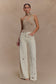 The LEONE One Shoulder Metallic Knit Top is designed to stand out in sun-drenched moments and after-dark glow. With an asymmetrical cutout neckline and a dramatic wrap-around neck sash, this longline silhouette is crafted in a lightweight metallic knit that catches the light with every movement. A delicate floral decal adds a romantic focal point, while the one shoulder design brings modern allure. Pair with wide-leg trousers or a flowing skirt for an effortlessly elevated resort look.