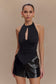 Turn heads with the LINDA Slinky Ruched Halter Top, a bold and sultry addition to your wardrobe. Featuring a chic halter neckline and a centre-front keyhole, this top adds just the right amount of allure. The pointed front hem creates a sleek, flattering silhouette, while the open-back design adds a daring, modern edge. Crafted from slinky, figure-hugging fabric and fully lined for comfort, this top is perfect for pairing with high-waisted jeans or skirts for a look that’s effortlessly sophisticated and ready for any night out.