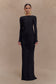 The LOUISA Long Sleeve Slinky Maxi Dress is an elegant statement in modern minimalism. Designed with a graceful boat neckline and a dramatic low V-back, this fully lined silhouette hugs the body with a sleek, fitted shape. Long sleeves and gathered shoulder details add soft volume, while a ruched hip brings subtle texture and movement. Finished in a floor-grazing maxi length, this dress is made for evenings that call for quiet drama and effortless sophistication.