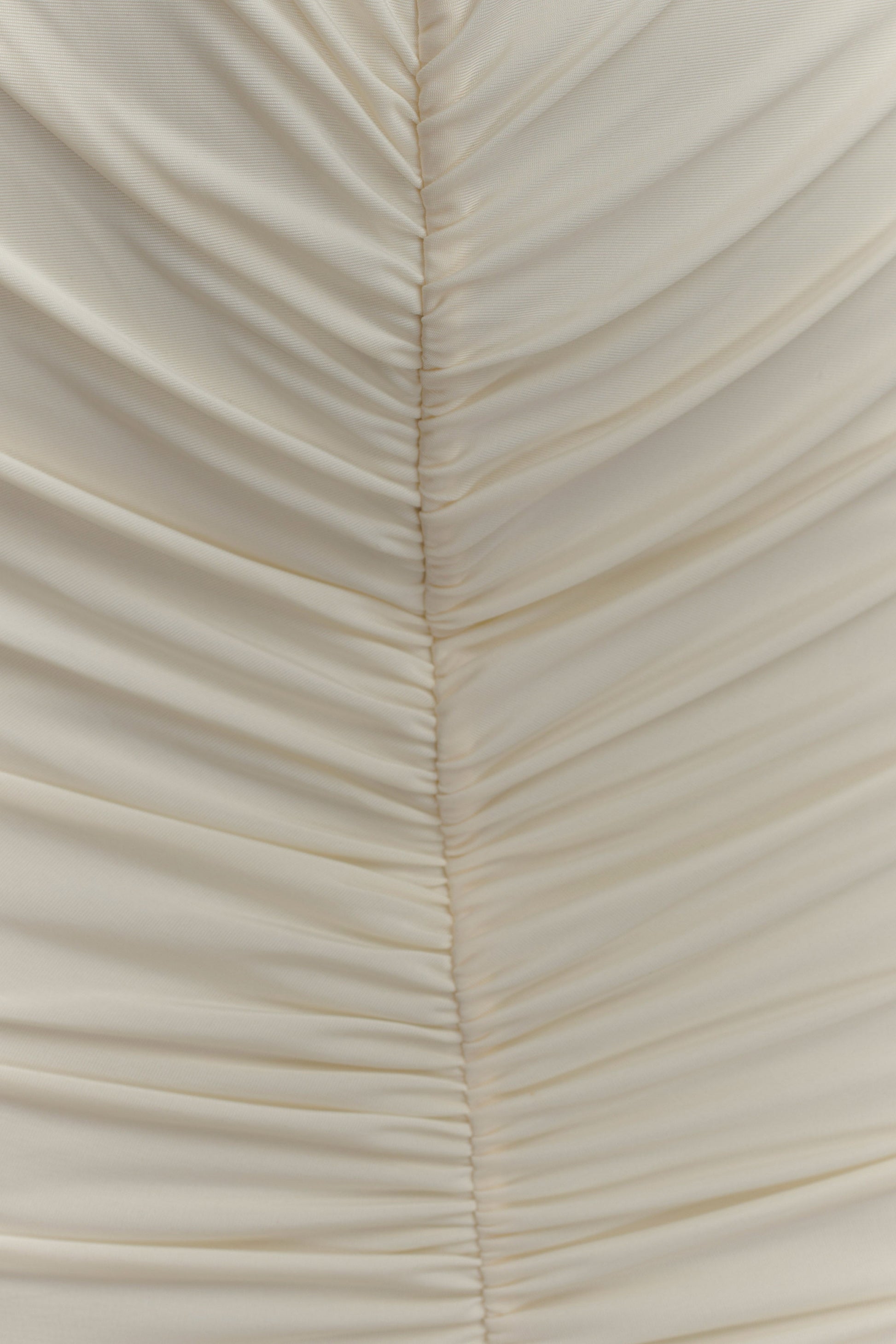 The LOUISA Long Sleeve Slinky Maxi Dress is an elegant statement in modern minimalism. Designed with a graceful boat neckline and a dramatic low V-back, this fully lined silhouette hugs the body with a sleek, fitted shape. Long sleeves and gathered shoulder details add soft volume, while a ruched hip brings subtle texture and movement. Finished in a floor-grazing maxi length, this dress is made for evenings that call for quiet drama and effortless sophistication.