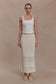 The MADELINE Scallop Knit Midi Skirt is a refined knitwear staple with a feminine touch. Designed with a high waisted fit and a straight silhouette, this maxi-length skirt features intricate pointelle knit detailing and scalloped edges at the waist and hem for added texture and charm. Unlined for a lightweight, breathable feel, it’s perfect for warm days and easy layering. Pair with the Madeline Scallop Knit Top for a coordinated look that blends softness, structure, and timeless appeal.