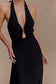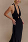 The MALAKHAI Chiffon Halter Maxi Dress is your go-to for effortless glamour, from sunlit lunches to evening soirees. Featuring a deep V halter neckline with subtle front gathering and a structured wire insert to hold its shape, this silhouette flatters with a bodycon fit through the bodice and a soft A-line flare at the hips. A side seam invisible zipper keeps the finish clean, while the sleek hardware neck closure adds a refined edge. Fully lined and designed without padding for a natural, easy fit, this dress is made to move with you from day to night.