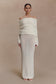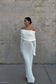 Marisol dress has quickly become a go-to piece thanks to its chic design and impressive versatility. The dress features an off-shoulder neckline with a draped overlay and long, flared sleeves, lending it an elegant yet relaxed vibe.
