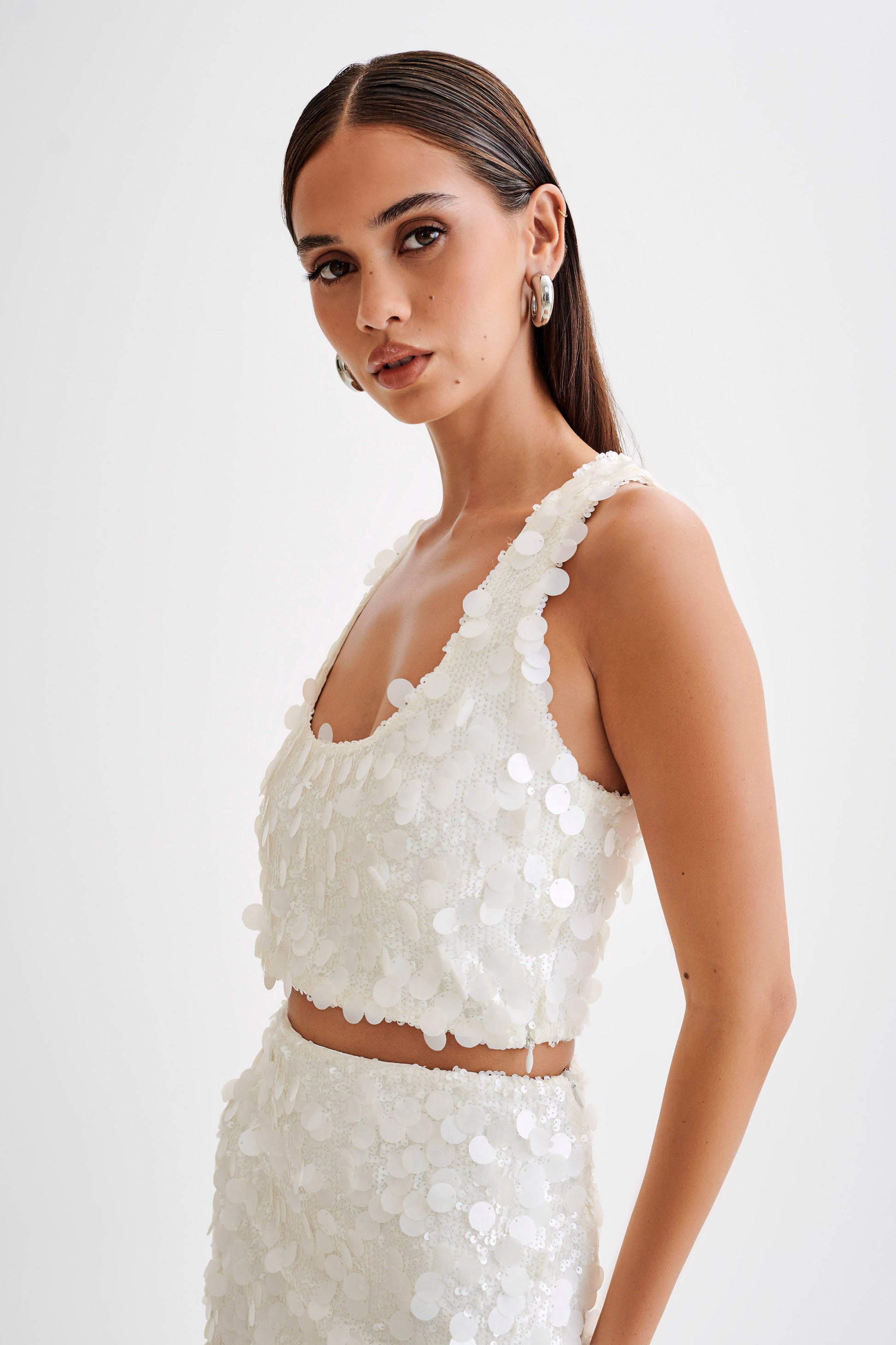 The MAUDE Transparent Sequin Racer Crop Top has been designed to match the Maude Transparent Sequin Mini Skirt With Split, or with any of your favourite MESHKI denim jeans. Featuring a racerback cut, this top frames the shoulders with a sporty feel contrasted by the luxurious sequin fabric that shimmers and shines with every movement. Lined for added comfort and coverage, this top offers a smooth and seamless fit that flatters your silhouette while providing the perfect amount of support.