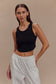 The MORGANA Ribbed Tank Top is a versatile staple that blends comfort with modern style. Featuring a crew neckline and a racer-back shape, this top offers a sleek and sporty silhouette. The cropped length and rounded hem add a flattering, contemporary touch, making it perfect for layering or wearing on its own. Crafted from ribbed fabrication, it provides both texture and stretch for a comfortable fit. Finished with binded neckline and armholes, this tank combines durability with polished details. Pair it with the Campbell Cotton Wide Leg Pants for a relaxed yet refined outfit that transitions effortlessly from lounging to stepping out.
