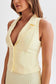 This is a sleeveless, single-breasted suiting vest with a deep V-neckline and functional front buttons. The lapel collar and longline bodice add structure to the soft, comfortable fabrication, seamlessly blending form and function. The silhouette is a suiting classic–clean lines, smooth edges, and subtle details. Minimalist and modern, MURA is a beautiful, versatile addition to your wardrobe for wear season after season. Complete the look with a structured, textured skirt like Mura Pleated Mini Skirt.