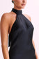 The PAULETTE is a satin maxi dress that sets a high halter neckline set against a deep open back. Designed to showcase your shoulders, it’s been finished with an oversized black bow detail that trails down your backline. Pair with the Fleur Thin Ankle Strap Heels to complete the look.
