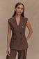 The PENELOPE Suiting Sleeveless Blazer is a bold take on classic tailoring. Designed with an asymmetric V-neckline and functional double-breasted button closure, this longline vest features structured shoulder pads for a confident silhouette. The sleeveless design adds a fresh, contemporary feel, while full lining ensures a smooth finish. Whether worn solo or layered, this blazer delivers power dressing with a modern twist. Pair with the Penelope Pleated High Waisted Pants for a coordinated look.