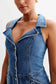 The PORTER Collared Denim Mini Dress is a stylish blend of classic and contemporary design. Featuring a unique square neckline and a chic collar, this sleeveless dress exudes modern sophistication. The functional centre front button closure ensures ease of wear, while the front and back skirt pleat detailing adds a touch of flair and movement. Complete with front and back pockets for added convenience, the Porter Collared Denim Mini Dress is perfect for both casual and dressy occasions, making it a versatile addition to any wardrobe.
