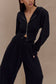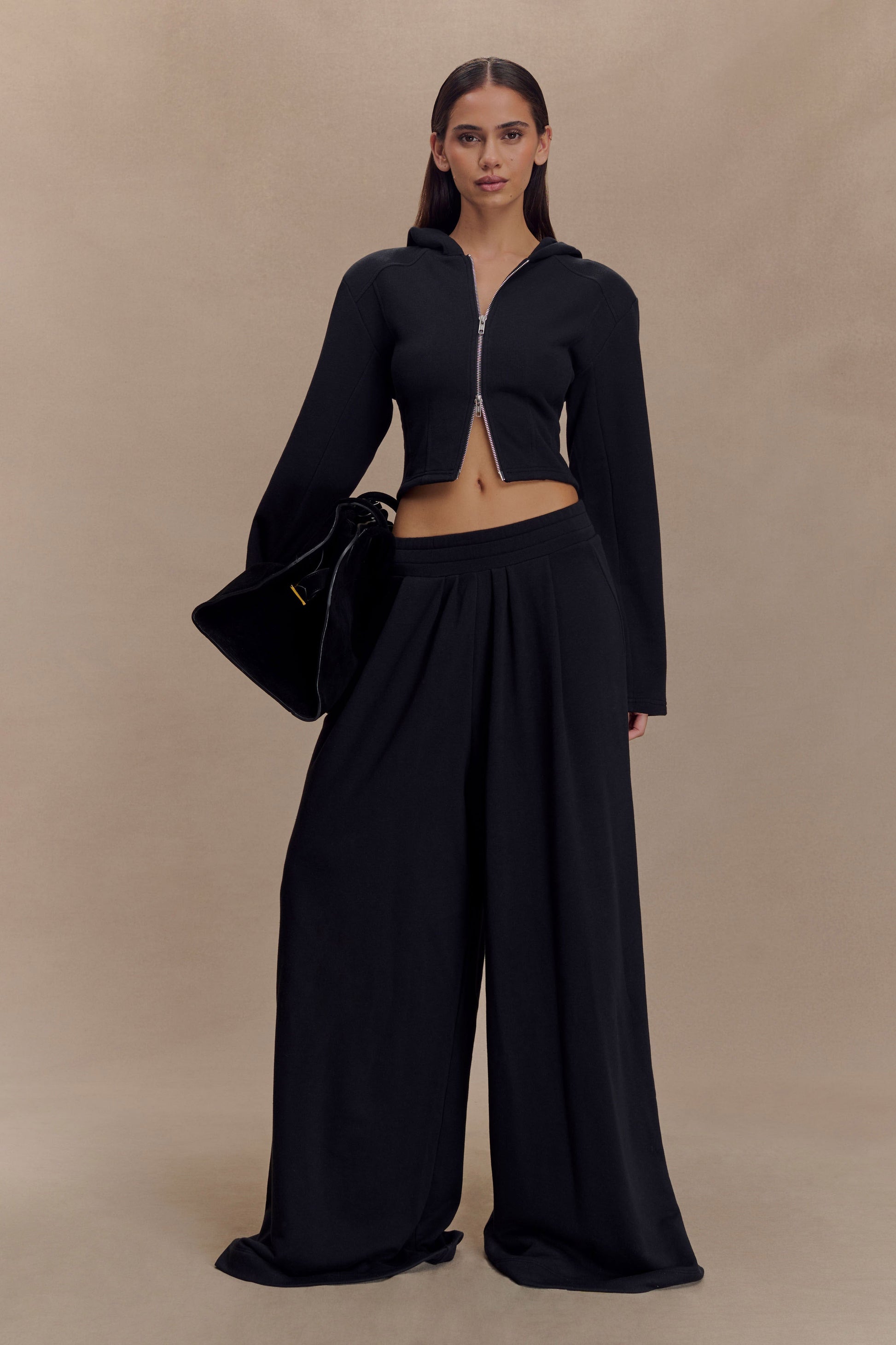 The QUINN Zip Up Hoodie redefines loungewear with a tailored edge. Featuring a functional double-ended zip front, this hoodie is designed with structured shoulder pads and a cropped length for a flattering, modern silhouette. The hood adds a relaxed touch, while long sleeves keep it cozy yet polished. Pair with the Aspen Gathered Wide Leg Jogger for a matching set that blends softness with statement-making structure.