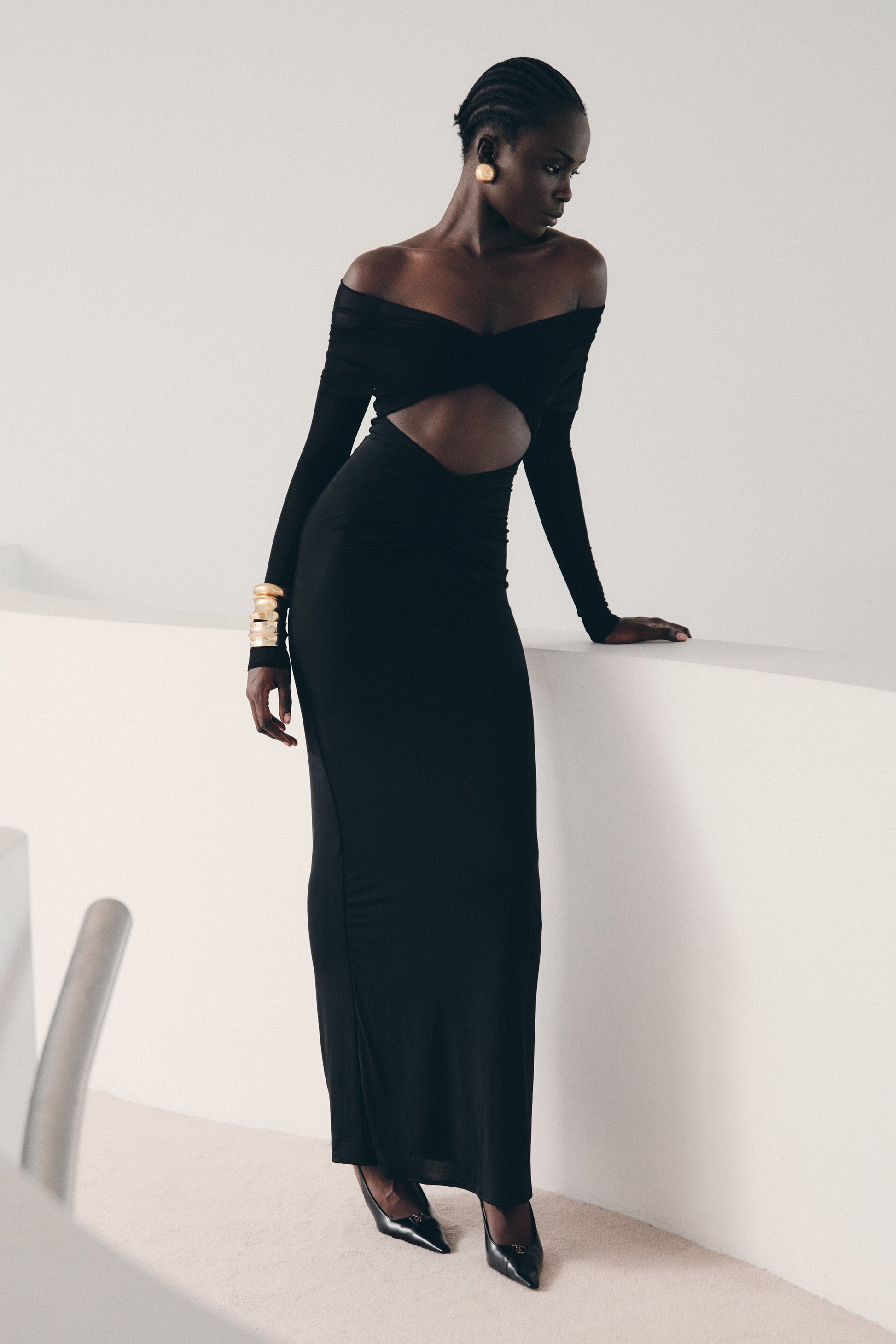 Step into the spotlight with the RAFAELLA Slinky and Mesh Maxi Dress, a statement piece that effortlessly blends texture and form. Featuring a plunging V neckline and mesh sleeves with a sheer shoulder panel, this design contrasts with a jersey bust and skirt for a flattering, body-hugging fit. Front and back gathering sculpt the silhouette, while a bold front cutout adds just the right amount of allure. Fully lined with a straight skirt shape and maxi length, this dress is your go-to for after-dark sophistication with a modern twist.