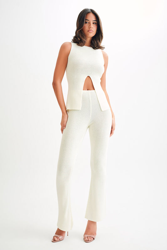 The RIDLEY Straight Leg Knit Pant offers a harmonious blend of comfort and contemporary style. These high-waisted pants feature a straight-leg design with an elastic waist for a flattering fit and effortless wearability. Crafted from unlined knitted fabric, they provide breathable comfort while maintaining a sleek appearance. Pair seamlessly with the Ridley Knit Tank Top With Split for a coordinated ensemble that transitions effortlessly from casual daytime outings to relaxed evening settings. Versatile and elegantly simple, the Ridley pants are a wardrobe staple for those seeking comfort and style without compromise.