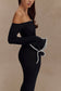 The SANDRINE Off Shoulder Knit Maxi Dress is a striking blend of romance and refinement. Designed with a Bardot neckline and long sleeves, this fitted silhouette features flared sleeve hems and delicate ripple panel detailing through the front. The fishtail hem and softly rippled finish create graceful movement, while the unlined knit fabrication hugs the body in all the right places. this dress is your go-to for elevated evenings, balancing softness with sculptural allure.