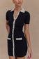 Elevate your style with the SEEMA Contrast Mini Dress, a perfect blend of sophistication and modern charm. Featuring a classic collared neckline and short sleeves, this mini-length design is both polished and playful. The contrast center-front placket, collar, and pockets add striking definition, while gold non-functional buttons lend a touch of elegance. Crafted from a soft knit fabric, the Seema dress is as comfortable as it is stylish, making it a versatile choice for brunches, meetings, or evening outings.