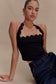 Elevate your wardrobe with the SELENA Scalloped Jersey Halter Top, a chic blend of modern sophistication and playful charm. Featuring a flattering halter neckline with adjustable ties, this top offers a customisable fit that highlights your shoulders and décolletage. The scalloped neckline detail adds a touch of elegance, while the cropped length keeps it fresh and contemporary. Perfect for pairing with high-waisted jeans, skirts, or shorts, this top is a versatile piece that transitions seamlessly from casual outings to stylish evenings.