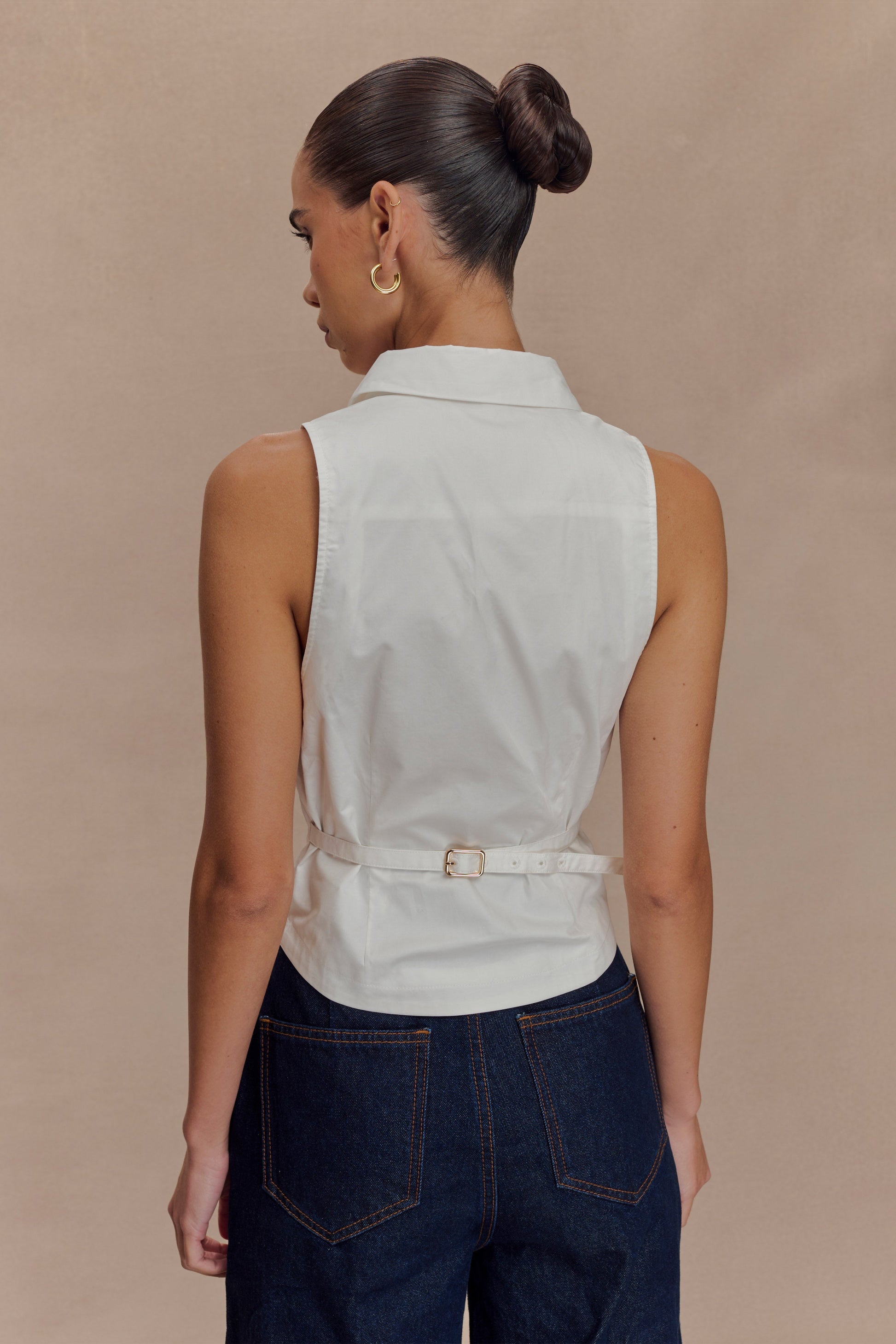The SELENE Sleeveless Halter Shirt is a fresh update to classic shirting. Designed with a sharp collar and button front opening, this fitted silhouette features a back belt detail that cinches the waist for a flattering, feminine shape. The curved hem adds softness to its structured design, while the unlined finish keeps it lightweight and breathable. Perfect for polished days or elevated layering, this shirt is your go-to for versatile, refined styling.