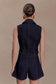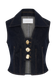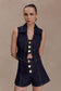 The SHONA Denim Vest With Decorative Buttons reimagines classic denim through a sharp, contemporary lens. Designed with a structured collar and sleeveless silhouette, it features panel seams that contour the body with a flattering, tailored fit. A button-front closure is finished with custom decorative buttons, adding a refined point of interest. Polished yet versatile, this vest is made to elevate everyday denim styling — perfect layered or worn solo for a confident, modern look.